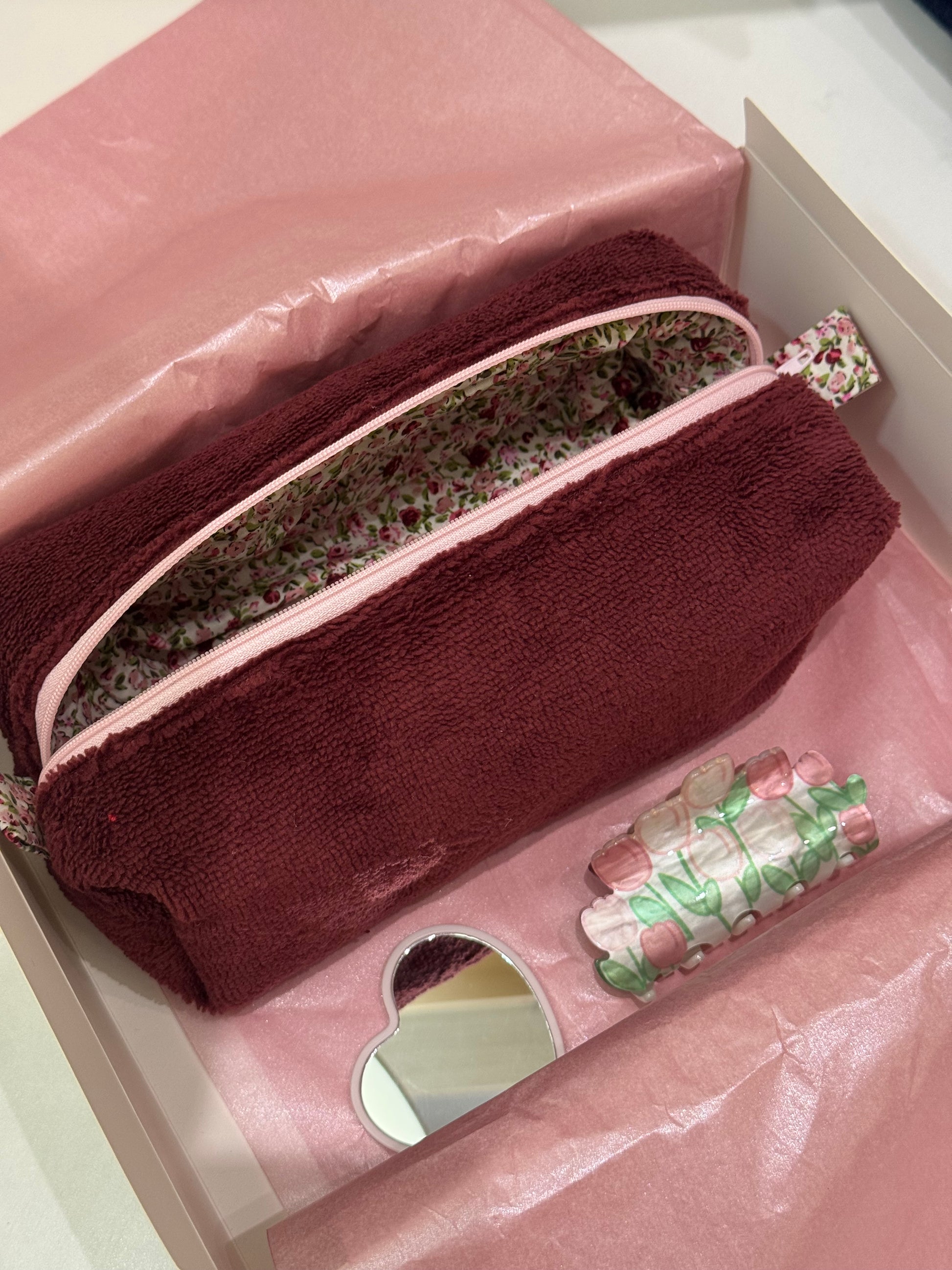 Box composto da beauty case Large spugna bambù bordeaux + molletta + specchietto