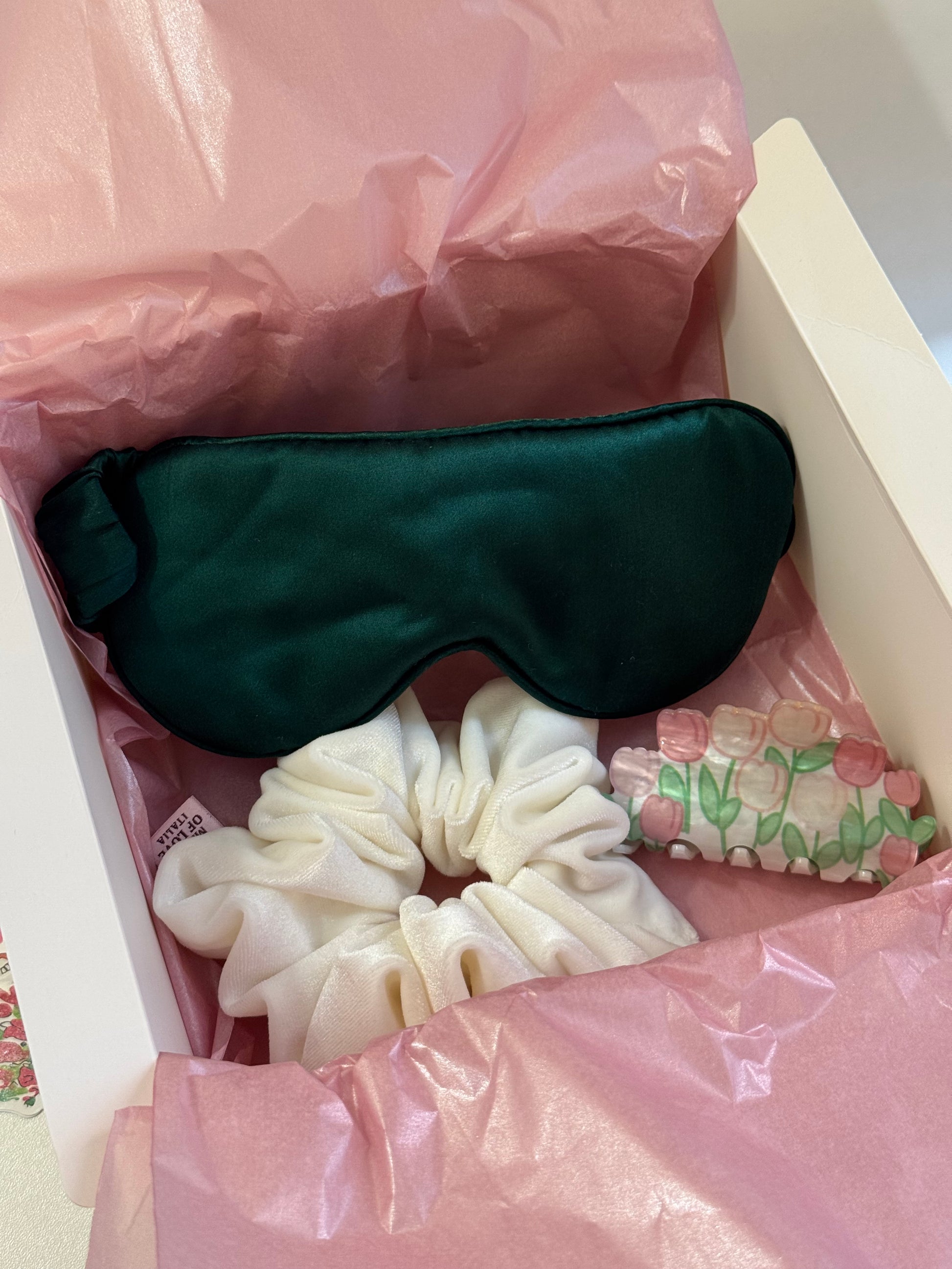 Mascherina da notte in 100% seta + scrunchie capelli velluto panna + molletta.